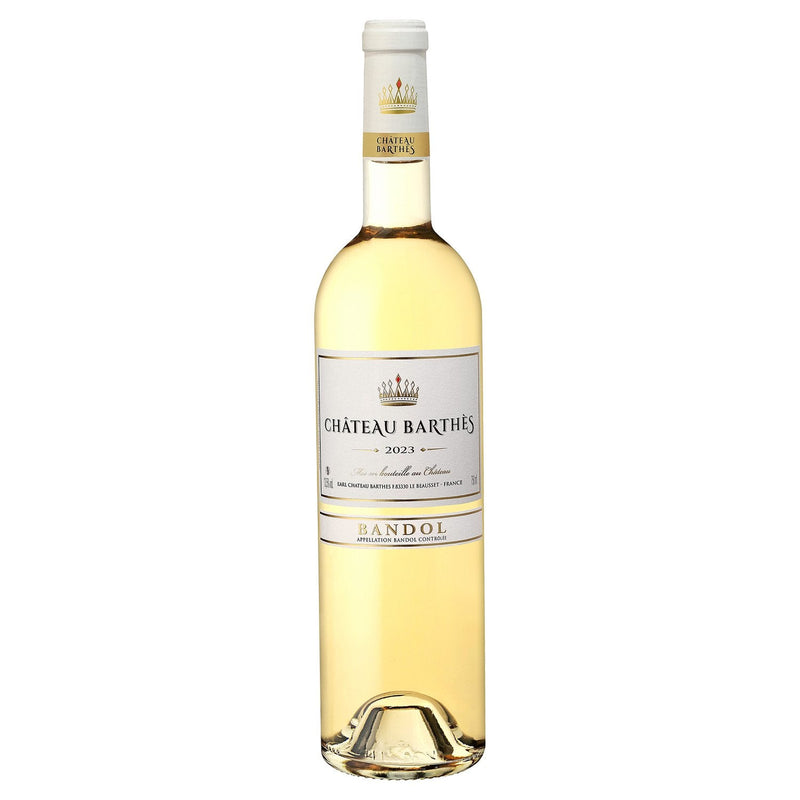 50 % Clairette, 40 % Ugni blanc, 5 % Rolle (Vermentino) and 5 % Sauvignon blanc. White Bandol is a relative rarity though becoming slightly more popular. From higher fresher limestone terroirs that have a cooler north facing exposition. Fresh and gently perfumed with hints of provencal herbs and weight and sophistication. This delicious white from Barthès suits so well any aperitif or seafood situation.